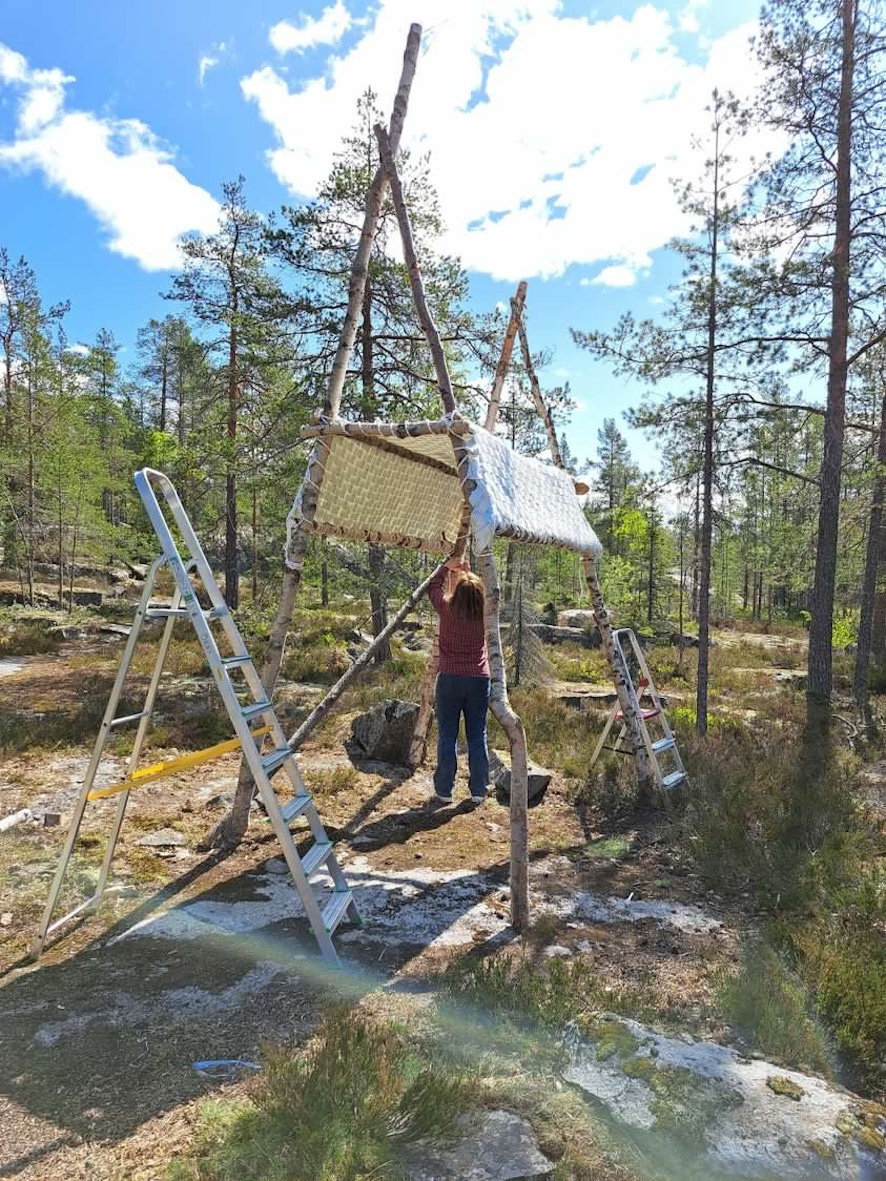 Mitt konstverk Nomad på plats. Lite finjusteringar och sista knutarna. Öppning av konstleden Wander Wonder och leden Fyra berg. Örnsköldsvik, Toppen av Varvsberget. Sommaren 2023.